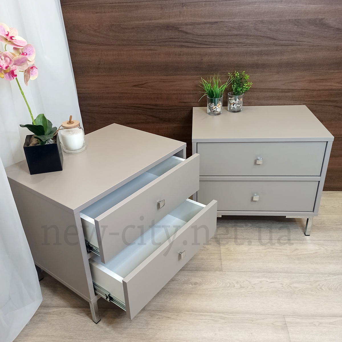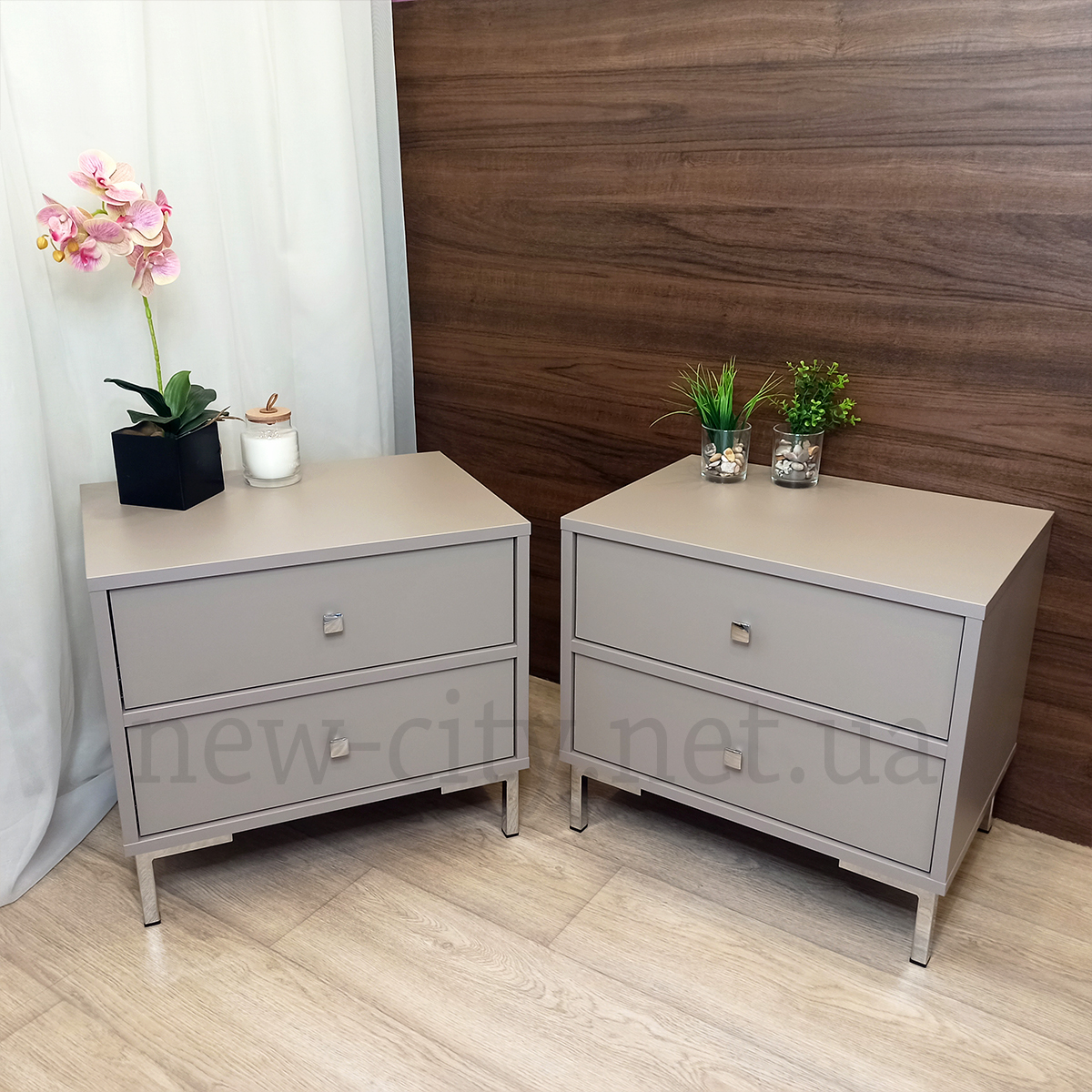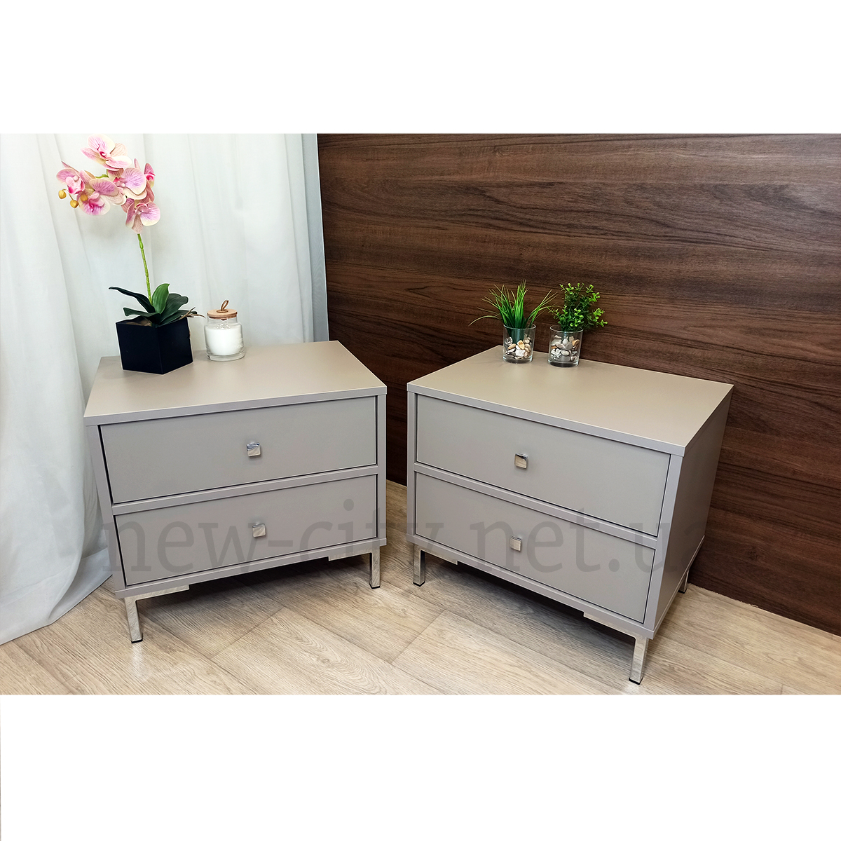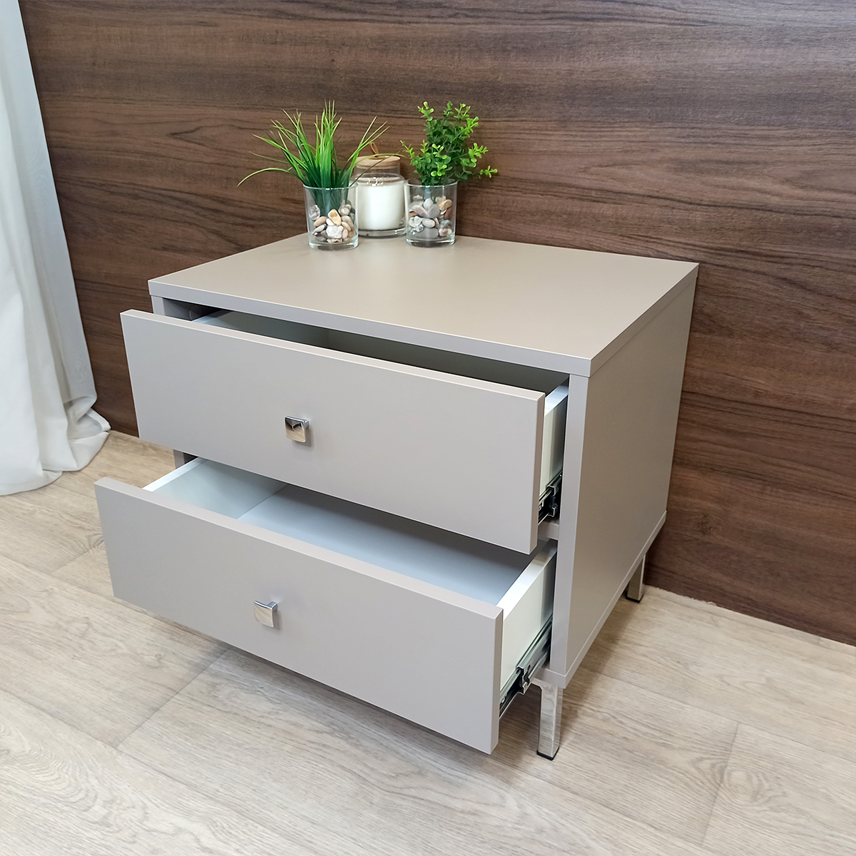 Очень нежное сочетание светло-серого с бежевым оттенком австрийского ДСП Эггер с хромированными ножками и ручками